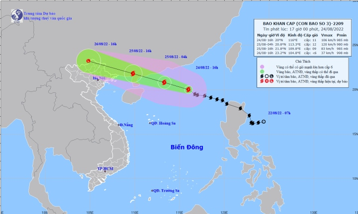 Theo Trung tâm Dự báo KTTV quốc gia, lúc 16h ngày 24/8, vị trí tâm bão ở khoảng 20,0 độ Vĩ Bắc; 116,0 độ Kinh Đông, trên khu vực phía Bắc Biển Đông, cách bán đảo Lôi Châu (Trung Quốc) khoảng 630km về phía Đông Đông Nam.