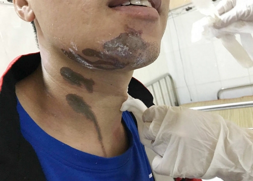 Anh này vội tới Bệnh viện Trưng Vương (TP.HCM) thăm khám trong tình trạng mặt, cổ và tay bị bỏng nặng. Số hóa chất anh mua ở chợ.