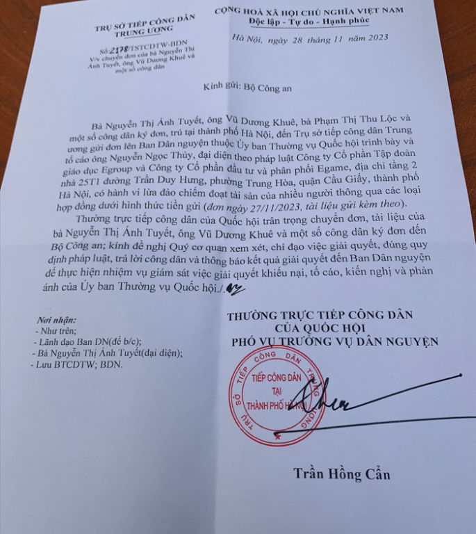 Bà Nguyễn Thị Ánh Tuyết, ông Vũ Dương Khuê, bà Phạm Thị Thu Lộc và một số công dân ký đơn, trú tại TP Hà Nội đã gửi đơn lên Ban Dân nguyện thuộc Ủy ban Thường vụ Quốc hội trình bày và tố cáo ông Nguyễn Ngọc Thủy, đại diện theo pháp luật của Công ty cổ phần tập đoàn giáo dục Egroup và Công ty cổ phần đầu tư và phân phối Egame, địa chỉ nhà 25T1 đường Trần Duy Hưng, phường Trung Hòa, quận Cầu Giấy, TP Hà Nội, có hành vi lừa đảo chiếm đoạt tài sản của nhiều người thông qua các loại hợp đồng dưới hình thức tiền gửi.