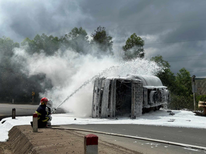 Rất may sau khi xe bồn bị tai nạn, tài xế nhanh chóng thoát khỏi ra ngoài nên không gây thiệt hại về người.