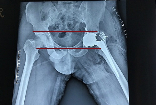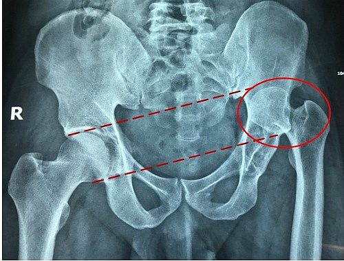 Nam bệnh nhân sinh năm 1981 bị ngã trong một lần leo cây năm sáu tuổi. Suốt 30 năm qua anh sống chung với đôi chân không cân đối, bước đi thấp cao. Mỗi khi thay đổi thời tiết, chân anh thường đau nhức. Gần đây vùng khớp háng trái đau nhiều, anh phải đi nhiều nơi chữa trị.