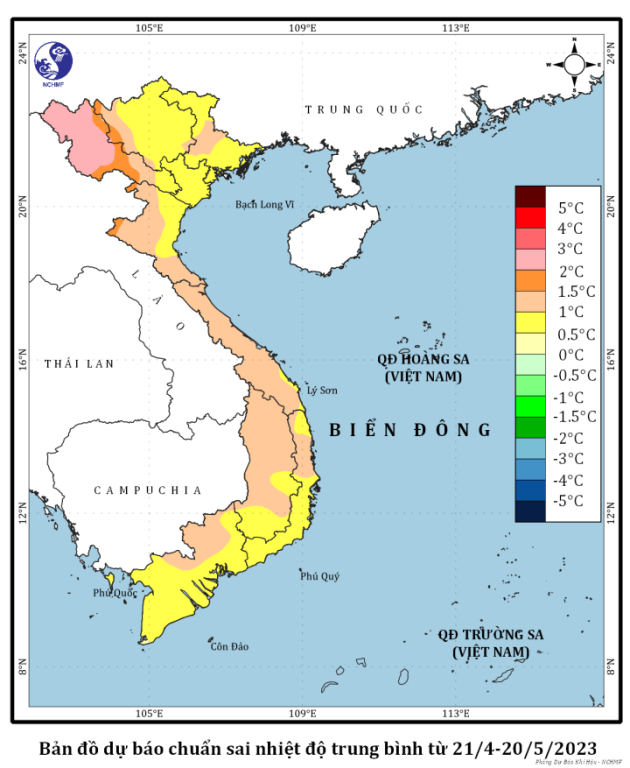 Theo Trung tâm Dự báo khí tượng thủy văn quốc gia, trong thời kỳ dự báo (từ 21/4 đến 20/5/2023), nhiệt độ trên phạm vi toàn quốc phổ biến ở mức cao hơn từ 0,5-1,5 độ C so với trung bình nhiều năm (TBNN) riêng khu vực Tây Bắc Bộ có nơi cao hơn khoảng 2 độ C so với TBNN.