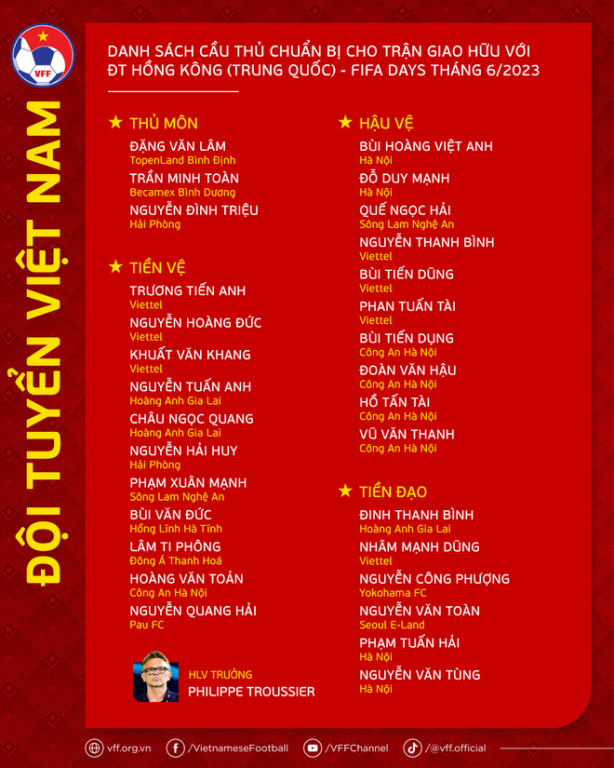 Ngày 12-6, HLV Philippe Troussier đã quyết định loại 4 cầu thủ để rút gọn danh sách ĐT Việt Nam chuẩn bị cho trận đấu giao hữu với ĐT Hồng Kông (Trung Quốc) xuống còn 30 người, trong đó có Công Phượng, Quang Hải và Văn Toàn.