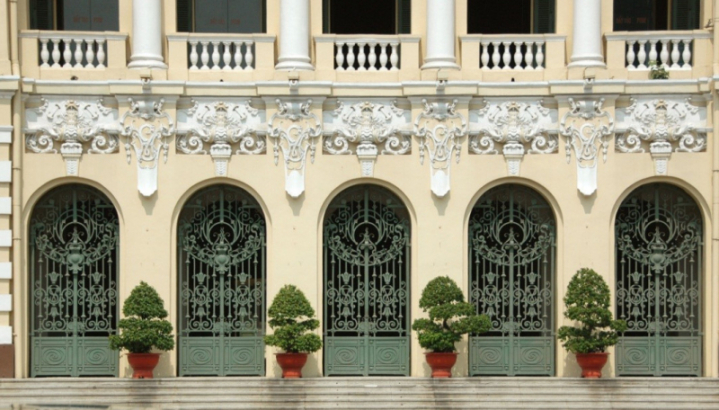 Trụ sở nằm trong khuôn viên có diện tích khoảng 7.500m2. Cổng chính hình vòm với năm cổng rộng, liên tiếp nhau cũng được trang trí khá cầu kỳ với những dây hoa, lá… Các cổng đều được làm bằng sắt và được uốn lượn hoa văn đẹp mắt. Cổng phụ ở mặt tiền là lối cho xe hơi chạy thẳng vào sân trong tòa nhà. Các mô – tip trang trí trên cổng phụ khá đơn giản với những tràng hoa cách điệu.
