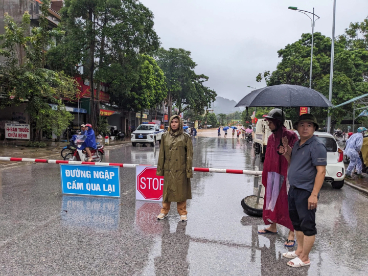 Đường QL48 đoạn qua thị trấn Tân Lạc, huyện Quỳ Châu cũng bị ngập, lực lượng chức năng phải trực gác, không cho phương tiện qua lại.