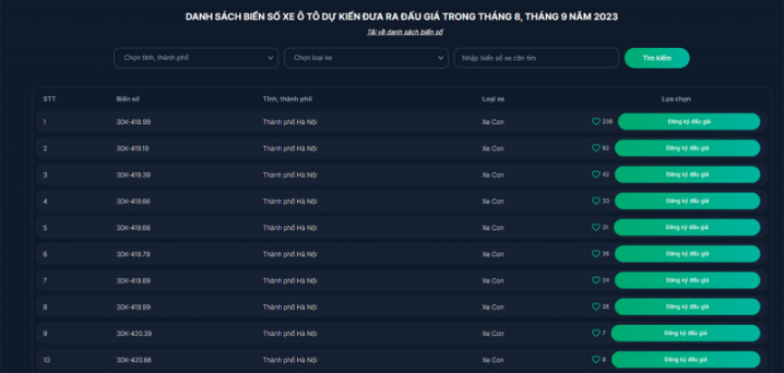 Lựa chọn biển số: Sau khi đăng nhập vào tài khoản của mình, người dân có thể lựa chọn biển số xe ô tô theo các tùy chọn trên trang thông tin đấu giá trực tuyến như: Tỉnh, thành phố, loại xe hoặc dãy số tùy ý theo sở thích.