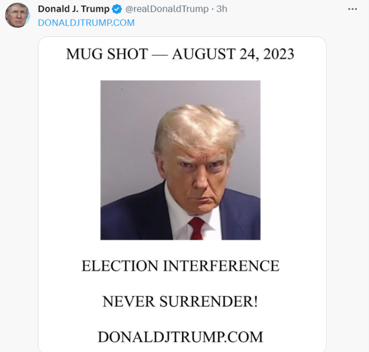 Sau khi làm thủ tục hồ sơ tù nhân tại nhà giam ở quận Fulton, bang Georgia, với các cáo buộc liên quan đến cố gắng lật ngược thất bại trong cuộc bầu cử năm 2020 tại bang này, cựu Tổng thống Mỹ Donald Trump được ra về theo thỏa thuận bảo lãnh và quay trở lại đăng bài trên mạng xã hội X (Twitter).