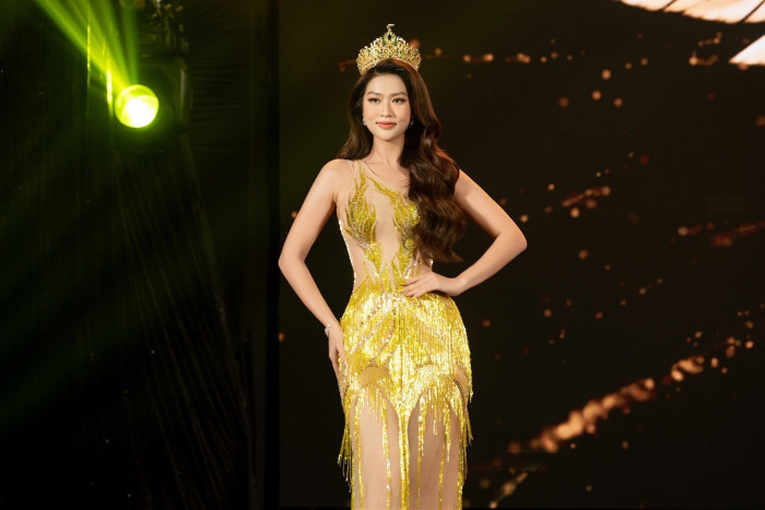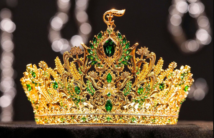 Điều đặc biệt của vương miện Miss Grand Vietnam 2023 là được chế tác từ vàng 24K, kết hợp cùng 872 viên đá kim cương zirconia, 380 viên Citrine vàng và 255 viên ngọc lục bảo xanh Emerald với nhiều kích cỡ khác nhau được cắt mài riêng theo tiêu chuẩn đặc biệt tạo nên sự lấp lánh, sang trọng, đẳng cấp.