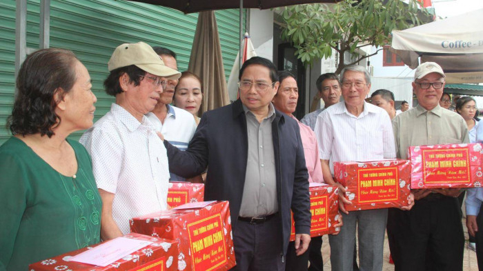 Tại đây, Thủ tướng ân cần thăm hỏi, chúc mừng năm mới, động viên bà con về cuộc sống mới sau khi nhường đất để thi công dự án sân bay.