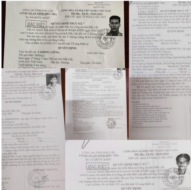 Ngày 1-7, Cơ quan An ninh điều tra Công an tỉnh Đắk Lắk cho biết, đơn vị đã ra quyết định truy nã đặc biệt đối với 5 đối tượng gồm: Y Khing Liêng (SN 1992, trú tại xã Hòa Sơn, huyện Krông Bông, tỉnh Đắk Lắk), Nay Yên (SN 1970, trú tại buôn Ea Klock, xã Cư Pơng, huyện Krông Búk, tỉnh Đắk Lắk), Y Jũ Niê (SN 1968, trú tại buông Kang, xã Ea Knuếch, huyện Krông Pắk, Đắk Lắk), Nay Tam (SN 1974, trú tại buôn Adrơng Điết, xã Cư Pơng, huyện Krông Búk, Đắk Lắk) và Nay Dương (SN 1968, trú tại buôn Ea Klock, xã Cư Pơng, huyện Krông Búk, Đắk Lắk) về tội: “Khủng bố nhằm chống chính quyền nhân dân”, quy định tại Điều 113 Bộ luật Hình sự.