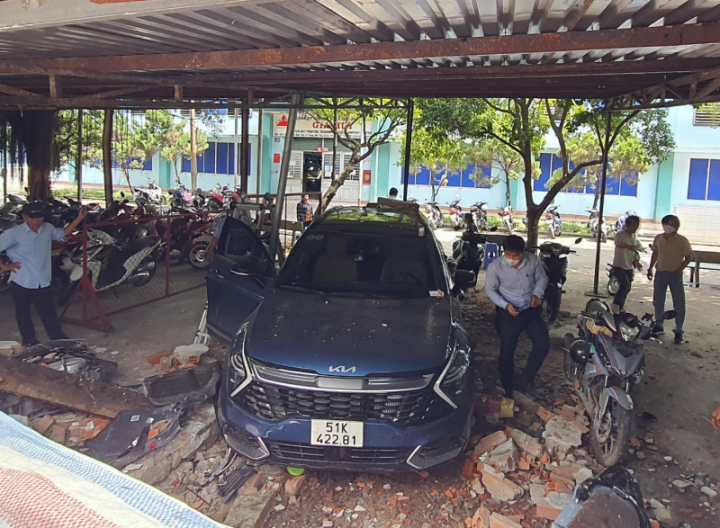 Tại hiện trường, bà G được người dân đưa vào bệnh viện cấp cứu. Phía sau bức tường bị sập là bãi giữ xe gắn máy. Nhiều xe máy đang đậu ở đây bị xe ô tô làm hư hỏng nặng.